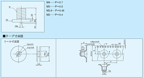 自動挿入機対応の表面実装用ネジです。下のポッチは位置ずれを防ぐためにつけてあります。1φのスルーホール穴をあけてください。色々な物を取り付けることができます。電気を流すこともできます。エンボステープに収納されています。・材質 黄銅・処理 ニッケル下地スズメッキ・定格電流 30A・締付トルク 5kg・f・cm以下●リール品3SN-4-T 入数:900本3SN-5-T 入数:800本3SN-6-T,3SN-7-T 入数:600本3SN-8-T 入数:500本※写真はイメージです。※在庫切れの場合は別途御相談させて頂きます。