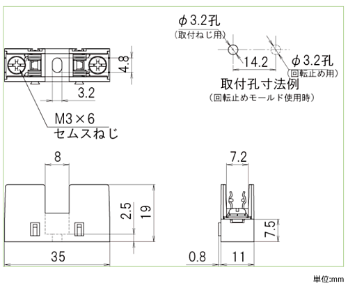 1Pのヒューズホルダー(ネジ締付端子) 連結して増極可能です。 UL,c-UL規格認証品(規格品として、 F-710-FC2と、F-1000-S1が装着可能です) 仕様 ・定格 250V-10A ・絶縁抵抗 DC500V、100MΩ以上 ・耐電圧 AC2000V (1分間) ・取得規格 UL規格・C-UL規格 ・絶縁材 (本体) PBT (UL94V-0) ・本体色 W (白) ・端子金具 ねじ締付端子 (M3×6 セムスねじ) ・端子ねじ締付けトルク 0.5N ・m ・取付ねじ締付けトルク 0.5N ・m : M3ねじ、平ワッシャー使用時 使用上の注意 ・F-710-FC2はUL、C-ULで使用を認められています。 ・規格品としてご使用の場合は、規格上の制約等をご確認ください。 ※写真はイメージです。 ※在庫切れの場合は別途御相談させて頂きます。
