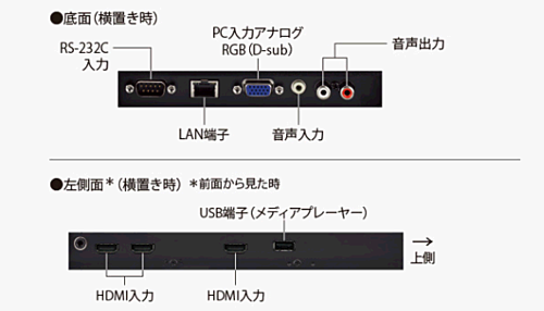 〈86V型~43V型まで豊富なサイズ展開〉広いスペースで大勢にアピールしたい場合は大型、近づいてじっくり読ませたい場所では小型など、設置場所や表示用途に合わせて、最適なサイズが選べます。〈高精細4K液晶パネル搭載〉4K解像度(3,840×2,160)のくっきりとした画質で、写真や映像をよりリアルに表示できます。 〈4K画像対応の簡易メディアプレーヤー内蔵〉4K画像を記録したUSBメモリー(市販品)を挿すだけで、自動的にスライドショー再生。朝が来ると自動で電源ON、夜になると自動で電源OFFする、スケジュール機能も搭載しています。※メディアプレーヤーの対応ファイルは、静止画:jpg(jpeg)、音楽:mp3、動画:mp4/tsになります。〈サイネージの幅が広がる縦置き対応〉設置スペースや表示したいコンテンツに合わせて、効果的な設置スタイルでお使いいただけます。〈PCと接続すれば自動で画面を表示〉ディスプレイを使用していない時は、消費電力を抑える信号待機状態に移行。HDMIまたはD-subケーブルでPCとつなぐだけで、すぐにディスプレイが信号待機状態から復帰して画面を表示します。※選択中の入力に映像信号が入力された場合。〈PCからのコマンドコントロールに対応〉制御用のRS-232C端子とLAN端子を搭載。別売のコンテンツ配信・表示システム e-Signage Sを利用することで、遠隔地からのPC制御も可能です。・最大解像度 3840×2160・輝度 350cd/㎡・視野角上下左右 178°・コントラスト比 4000:1※写真はイメージです。※在庫切れの場合は別途御相談させて頂きます。