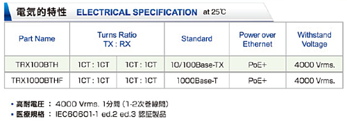 高耐電圧(4000Vrms.)パルストランス TRXシリーズ 【特長】 IEC60601-1認証取得した高耐電圧パルストランスです。 LAN経路の強化絶縁には欠かせない部品で、医療機器を始めとし強化絶縁を求められる様々な環境で使用できます。 10/100/1000BASE対応 【用途】 基板設計時に通信用PHYとRJ45の間に搭載することで強化絶縁を施せます。パルストランスは1:1タイプなので標準的なPHYと組合せ可能です。 また、強化絶縁を施していない装置にはLANケーブルに繋げるだけで使用できるタイプもございます。 【動作温度範囲】 0℃~+70℃ 【保存温度範囲】 -40℃~+85℃