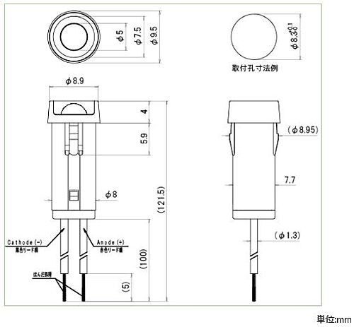 ■仕様 耐電圧:AC500V (1分間) 絶縁抵抗:DC500V、100MΩ以上 本体材質:ポリカーボネート 主絶縁材:PBT リード線:UL1007 AWG26 撚り線 本体色:B (黒)、W (白) レンズ色:R (赤)、G (緑)、Y (黄)、BL (青) パネル取付方式:ワンタッチ装着 取付板厚:0.5~2.0mm 使用上の注意: ①本製品には保護抵抗は内蔵されておりませんので、使用電圧に合わせた保護抵抗を直列に接続してご使用ください。②接続の際は極性にご注意ください。③取付板厚によって取付孔寸法が異なる場合もありますのでご確認ください。 ※在庫がある場合がございますので、お問合せください。