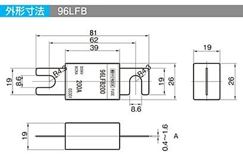 ●定格電圧(V):DC96 ●定格電流(A):325 ●端子 A寸法(mm):1.6 ●質量(g):55 ●電動フォークリフト等に最適 ※写真はイメージです。