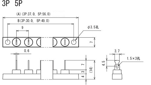 ■定格:125V-3A ■絶縁抵抗:DC500V、100MΩ以上 ■耐電圧:AC1000V(1分間) ■極数(P):10 ■主絶縁材:フェノール(UL94V-0) ■端子金具:ラグ端子 ■本体色:B(黒) ■取付方式:ネジ止め