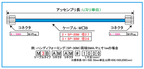 【特長】1.高周波特性 セミリジッドケーブル(SP-22)と同等の挿入損失、並びにVSWR 周辺温度変化に対する高い位相安定度を持ちます。2.柔らかさ 手軽にフォーミングが行え、形状を維持できます。 曲げに対する力は、従来のセミリジッドケーブルの約半分です。 (最小曲げR ⇒ M2B:5mm) ※ご注意:繰り返しの曲げ伸ばしは出来ません。3.曲げ加工図不要(少量多品種の打破) お役様で曲げていただける為、図面作成や多品種のご発注の手間が少なくなります。4.短納期対応 標準納期:3W以内(お問い合わせ下さい) 但し、在庫状況により即納も可。5.経済性 ケーブル、コネクタ共に弊社内製品です。 抜群のコストパフォーマンスをご提供いたします。※MOQ(最低発注数量)5本から承ります。コネクタA:SMA/PコネクタB:SMA/P