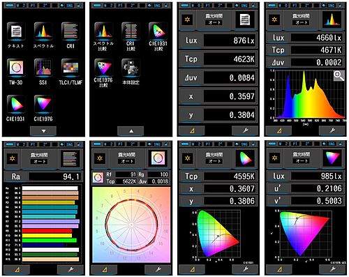 ●色温度(K)、偏差(⊿uv)、照度(lx)、光合成有効光量子束密度(PPFD)、色度(xy)、演色評価数CRI(Ra、R1~R15)や最新の演色評価指数(Rf、Rg、TLCI、TLMF、SSIt、SSId)の測定