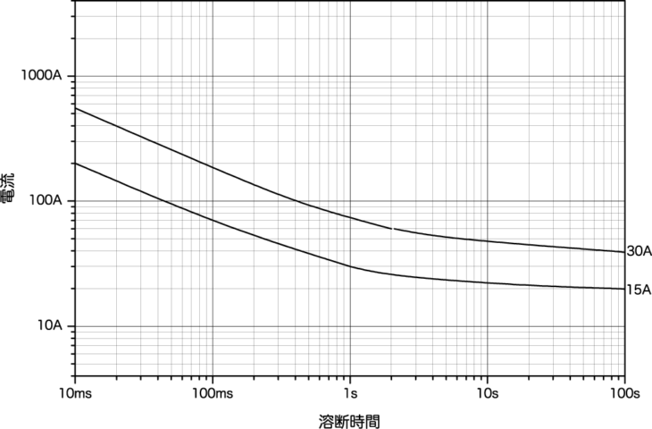 当社が試験条件を特定して測定した実測値の平均値をプロットしておりますので、保証値ではありません。ヒューズの特性は使用条件によって変化しますので、貴社のご使用条件下で、ヒューズが貴社のご要求を満足しているかを実際にご確認頂く必要があります。